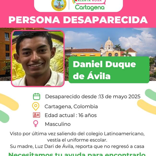 Cualquier información sobre Daniel, se puede comunicar a las líneas 315 338 6922 (Luz Dary de Ávila) o al 122 del CTI de la Fiscalía.