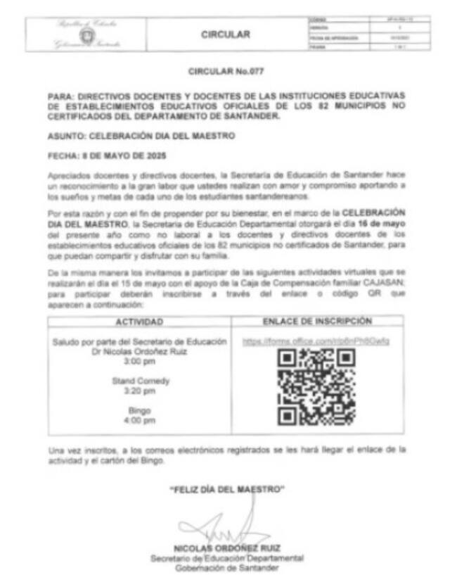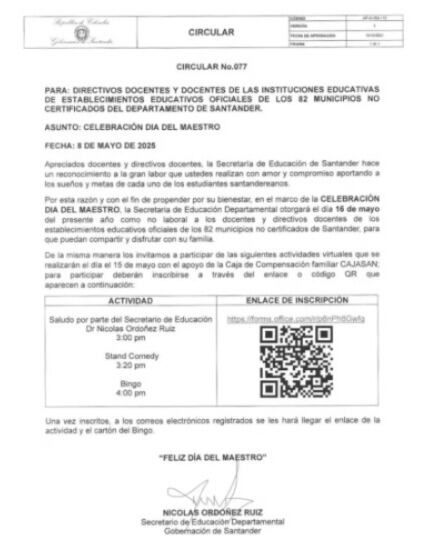 En la capital santandereana sí hay clases normal este viernes 16 de mayo. Por el Día del Maestro en Girón y Piedecuesta no hay clase, y en Floridablanca tampoco pero porque los docentes tenían pendiente un día de bienestar.