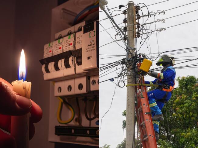 Persona haciendo mantenimiento en redes eléctricas y al lado una persona sin luz (Fotos vía Air-e y Getty Images)