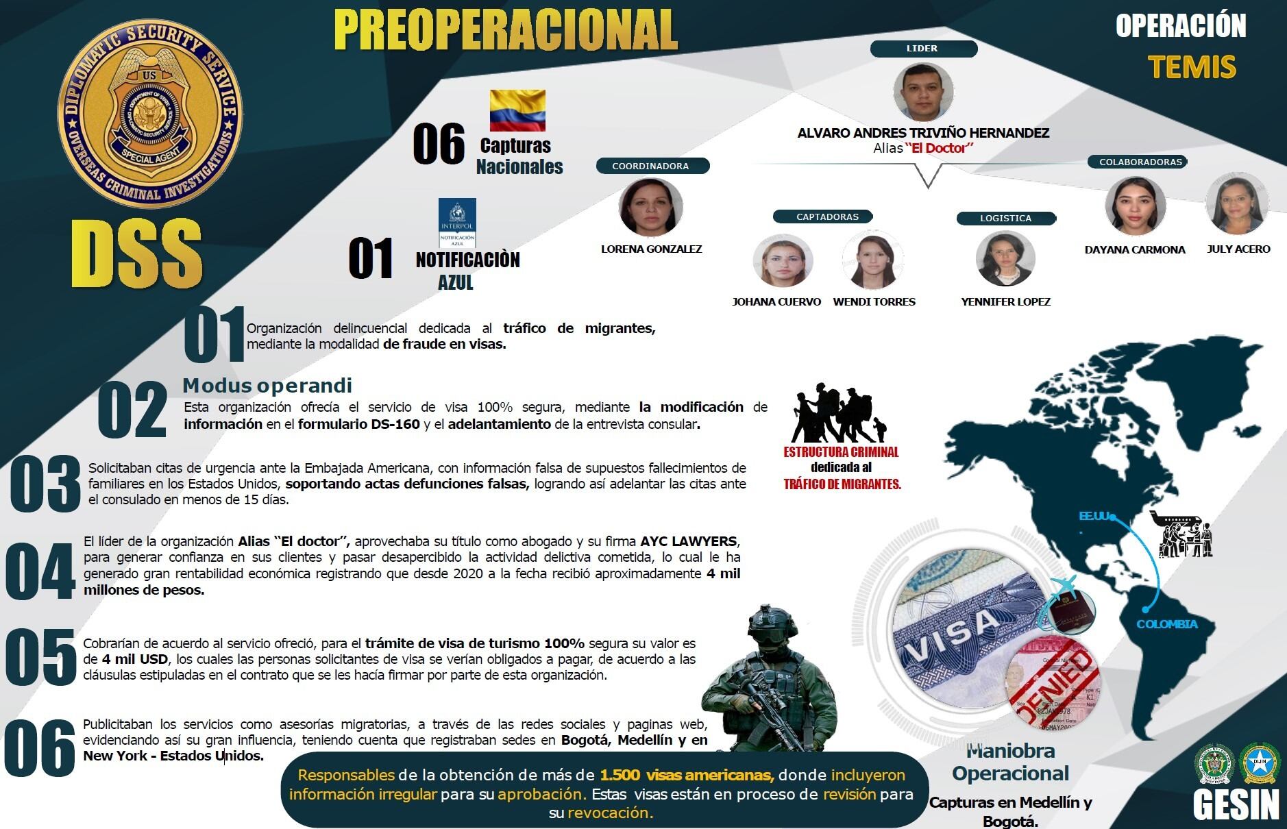 Agentes especiales del DSS e investigadores criminales de la Embajada de Estados Unidos en Bogotá iniciaron la en enero de 2024 con una investigación sobre Álvaro Andrés Triviño Hernández, sospechoso de asesorar a solicitantes colombianos para sus entrevistas de visa y de llenar sus solicitudes de visa de no inmigrante en línea desde sus despachos de abogados en Bogotá y Medellín.
