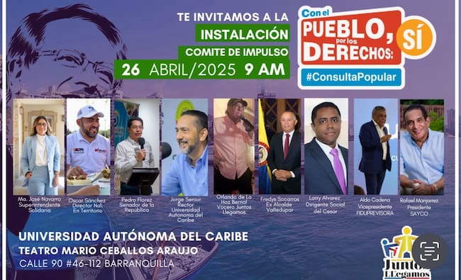 Una fotografía conocida por este medio, tomada en el marco de un comité de impulso de la consulta popular que se llevó a cabo en la ciudad de Barranquilla el pasado 26 de abril, muestra un panel de invitados que cuenta con algunos de los siguientes personajes: un exalcalde de Valledupar, Isidro Carraz; el director de Sayco, Rafael Manjarrez; y Óscar Sánchez, director nacional de EnTerritorio.