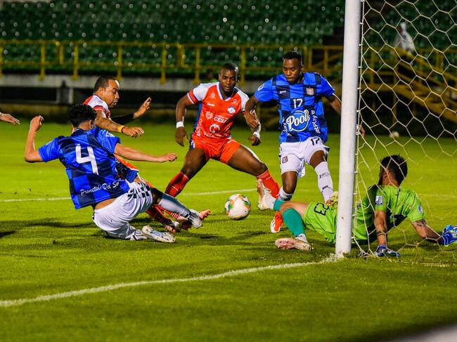Remate rechazado de Jairo Molina (Boyacá Chicó) remate de cabeza desde el centro del área. Asistencia de Estefano Arango con un centro al área.
