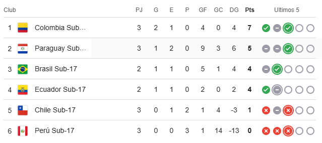 Estos dos resultados le permitieron al cuadro nacional llegar a 7 unidades y hacerse inalcanzable para las selecciones que ocupan el quinto y sexto lugar del hexagonal final en el Sudamericano Sub-17. Aunque Chile podría igualarla en puntos, el ítem de desempate es enfrentamiento directo y Colombia acaba de derrotarla.