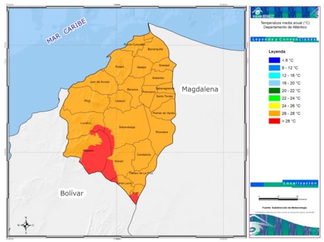 Teniendo en cuenta lo reportado por el más reciente Atlas Climatológico de Colombia, publicado por el Instituto de Hidrología, Meteorología y Estudios Ambientales (IDEAM) y realizado por esta entidad con información histórica, los municipios en los que se registran temperaturas más altas a lo largo del año en el departamento del Atlántico serían: Suan, Repelón y Manatí, que hacen parte de la subregión sur del departamento; pues son las zonas del territorio atlanticense en donde se registran temperaturas superiores a los 28 °C, teniendo en cuenta que estas temperaturas son diferentes a la sensación térmica. Así se evidencia en el mapa en el que ilustró la entidad esta información: