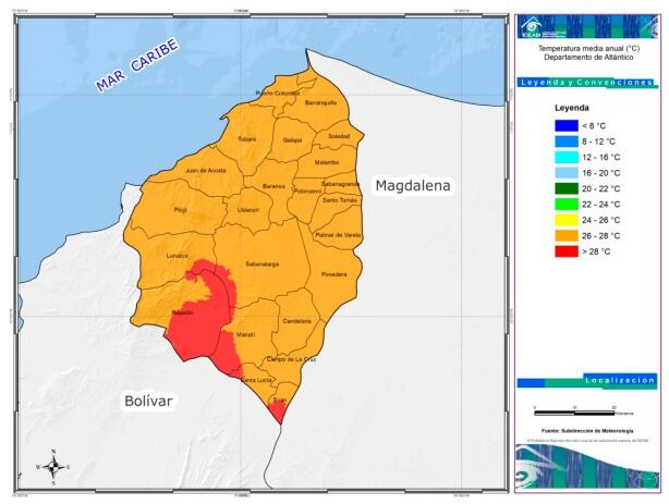 Teniendo en cuenta lo reportado por el más reciente Atlas Climatológico de Colombia, publicado por el Instituto de Hidrología, Meteorología y Estudios Ambientales (IDEAM) y realizado por esta entidad con información histórica, los municipios en los que se registran temperaturas más altas a lo largo del año en el departamento del Atlántico serían: Suan, Repelón y Manatí, que hacen parte de la subregión sur del departamento; pues son las zonas del territorio atlanticense en donde se registran temperaturas superiores a los 28 °C, teniendo en cuenta que estas temperaturas son diferentes a la sensación térmica. Así se evidencia en el mapa en el que ilustró la entidad esta información: