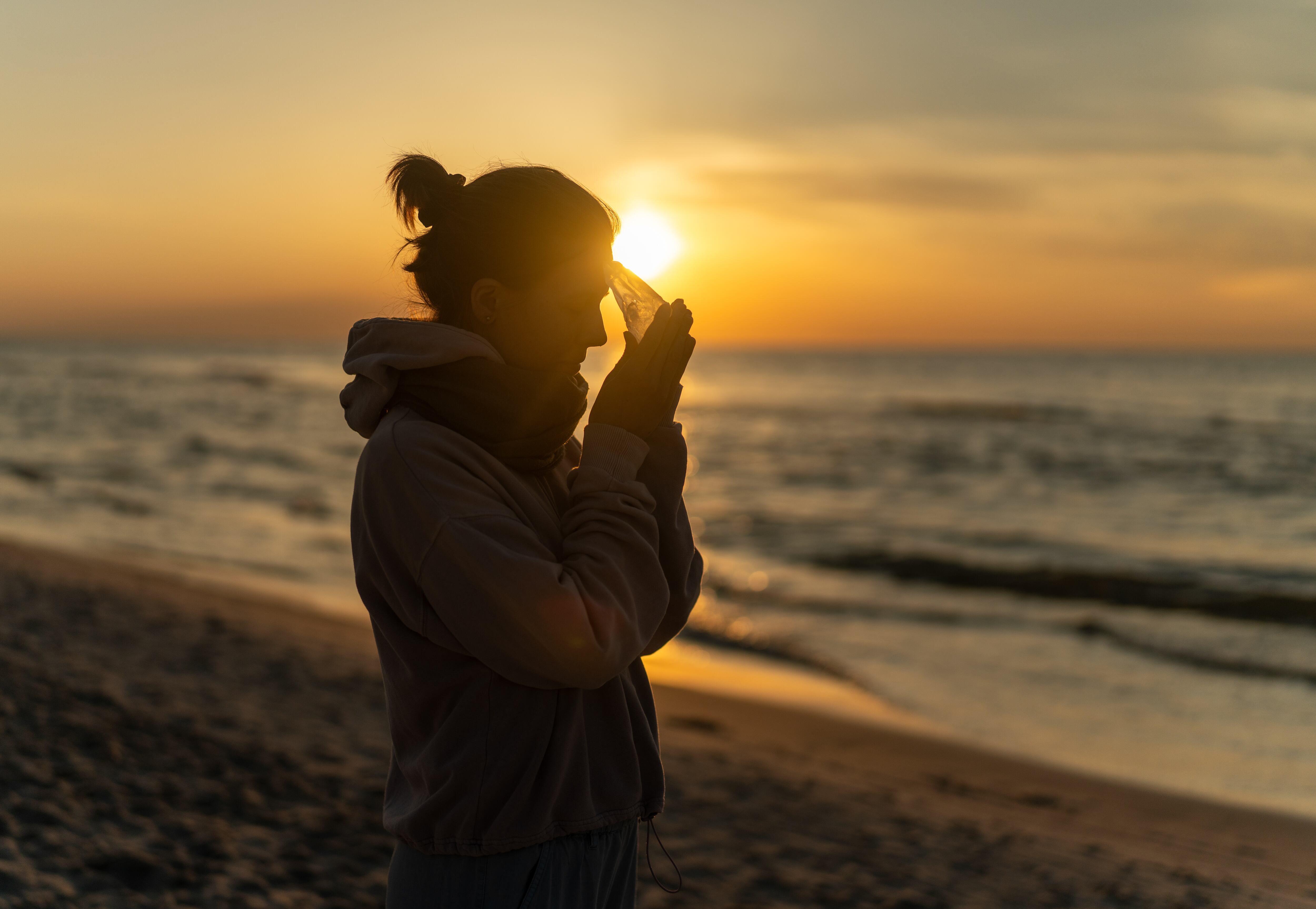 Healing crystal therapy by the sea. Crystal illuminated by the setting sun / janiecbros