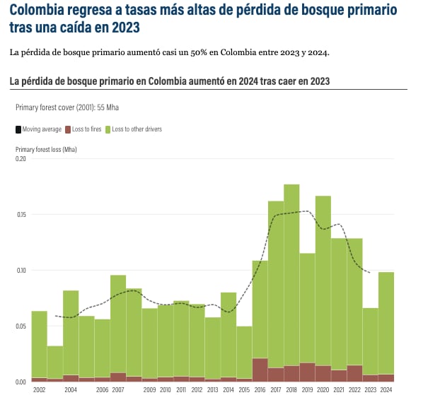 “La suspensión de las conversaciones de paz y el aumento de la violencia también han incrementado la minería ilegal y la producción de coca, además de impulsar la pérdida de bosques, afectando especialmente a las comunidades indígenas y en otras partes de Colombia, la conversión de bosques para la producción ganadera y las plantaciones de palma aceitera sigue siendo una de las principales causas de la pérdida de bosque primario”, explica el estudio.