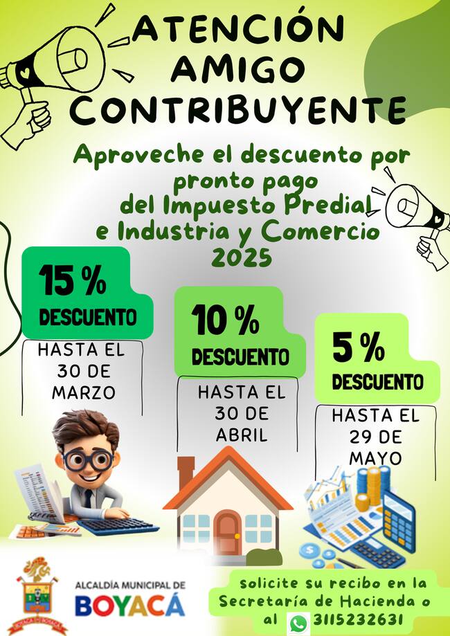 “La Administración Municipal, por medio de La Secretaría de Hacienda, invita a los contribuyentes del Impuesto Predial e Industria y Comercio para que aprovechen los descuentos por pronto pago que se encuentran vigentes y se acerquen a la Tesorería municipal a liquidar sus obligaciones”, explican en su página oficial.