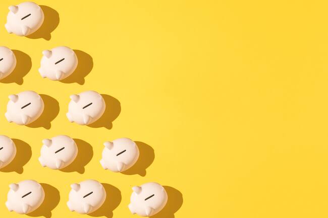 Little pink ceramic piggy bank pattern on the left side on yellow background. Concept of saving money, savings. / DBenitostock