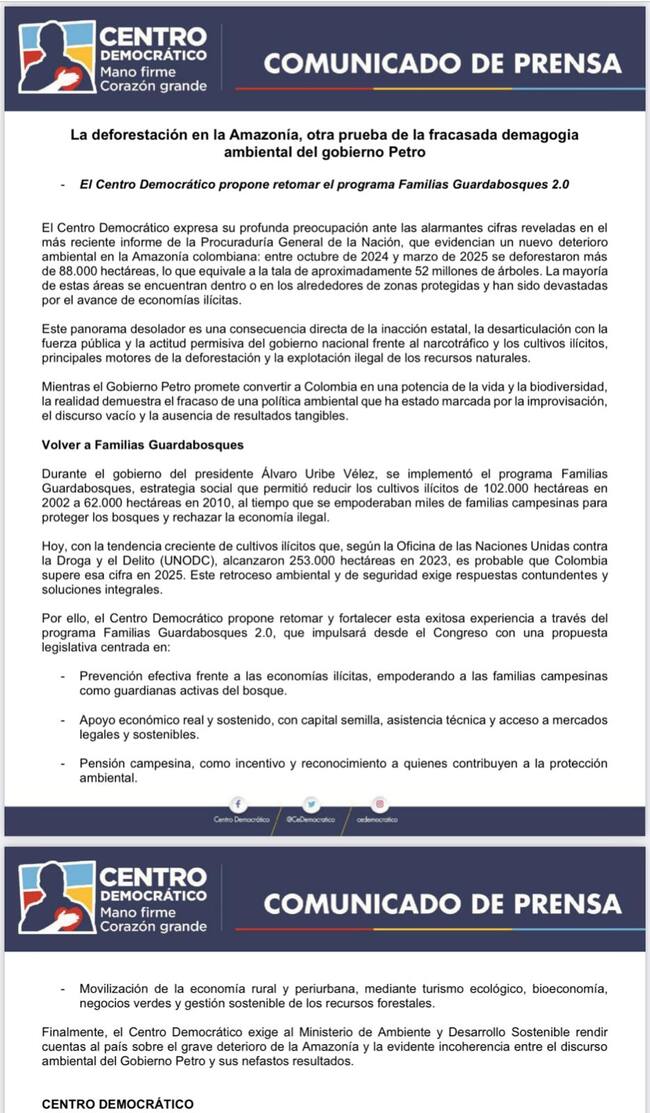 Además, el partido de oposición pidió revivir el programa ‘Familias Guardabosques’, una iniciativa que fue implementada durante el gobierno del expresidente Álvaro Uribe, que ofrecía incentivos económicos a comunidades locales a cambio de su compromiso con la conservación del bosque.