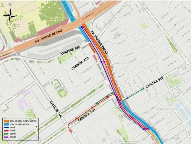 - Los usuarios que transitan en sentido Norte – Sur por la carrera 81G y desean continuar al Sur, deberán tomar la Av. Villavicencio al Occidente y carrera 81H al Sur (Mapa 2 color verde).