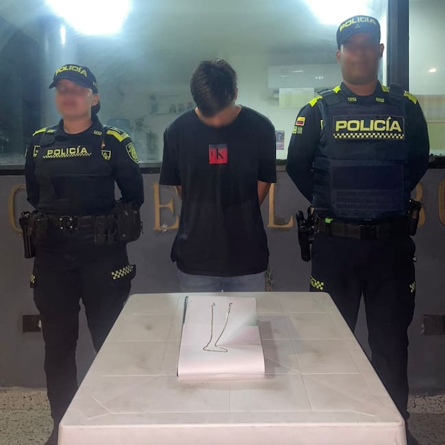 El capturado, conocido como ‘el Cueto’, fue sorprendido huyendo del lugar de los hechos, practicándole un registro personal, donde se le encuentra una cadena de oro, avaluada en 18 millones de pesos, la cual había sido hurtada minutos antes a un turista.
