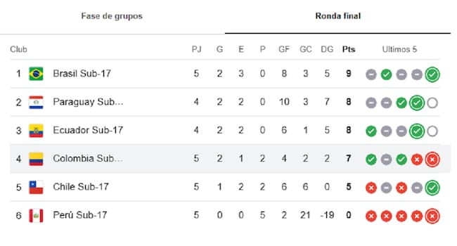 Tabla de posiciones del hexagonal final del Sudamericano Sub-17 / Tomado de Google