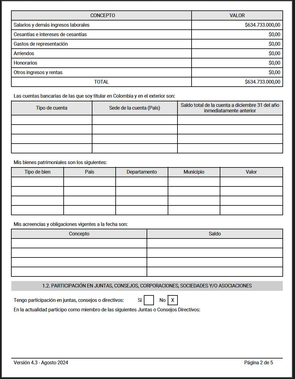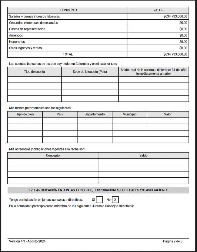 Aún así, al comparar la declaración de 2022 con la de 2023, el documento que aparece publicado en la página web de Función Pública se encuentra totalmente en blanco tanto en el espacio de bienes patrimoniales como en el de acreencias obligaciones vigentes.