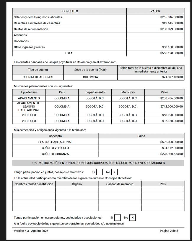 Allí, únicamente se evidencia que en todo el año, 2023, los salarios e ingresos laborales del expresidente de la Cámara de Representantes alcanzaron un valor de 634 millones de pesos.