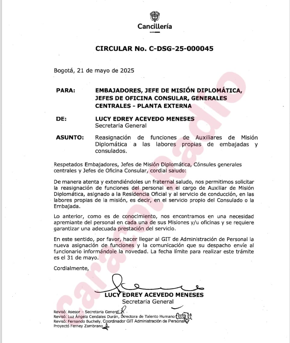 Dentro de la misma comunicación, se señaló que los Auxiliares de Misión Diplomática, asignados a Residencias Oficiales y servicios de conducción, deben prestar servicios en estas entidades. El plazo para realizar estos cambios será hasta el 31 de mayo de este año, de acuerdo con lo dicho por la Cancillería.