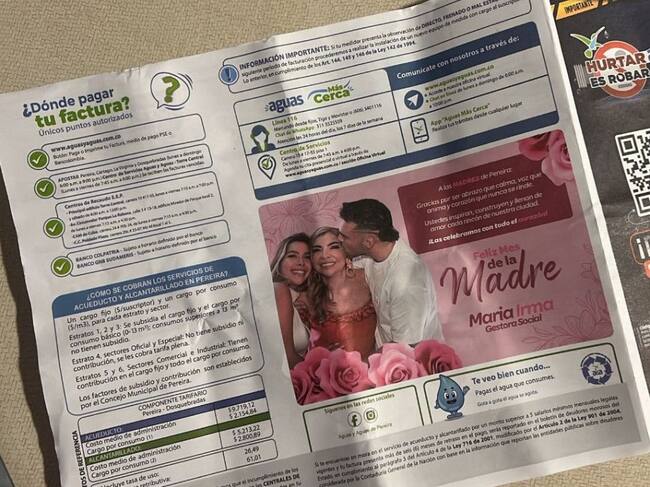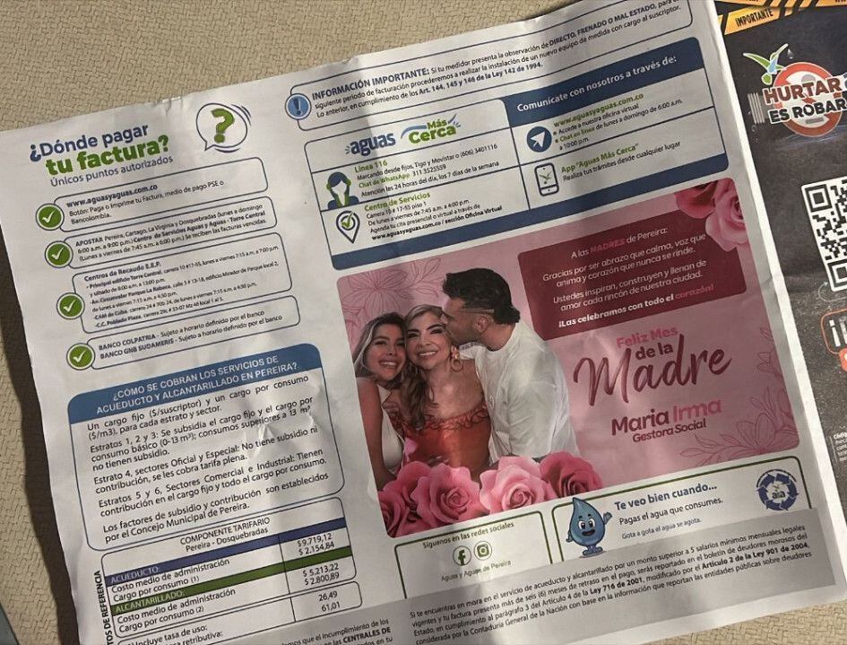 Luego de la polémica en redes sociales donde líderes políticos, denunciaron el uso de la imagen de la esposa del alcalde de Pereira, María Irma Noreña, en los recibos del servicio de Agua, decidió dar un paso al costado y dejó de ser la Gestora Social de Pereira.