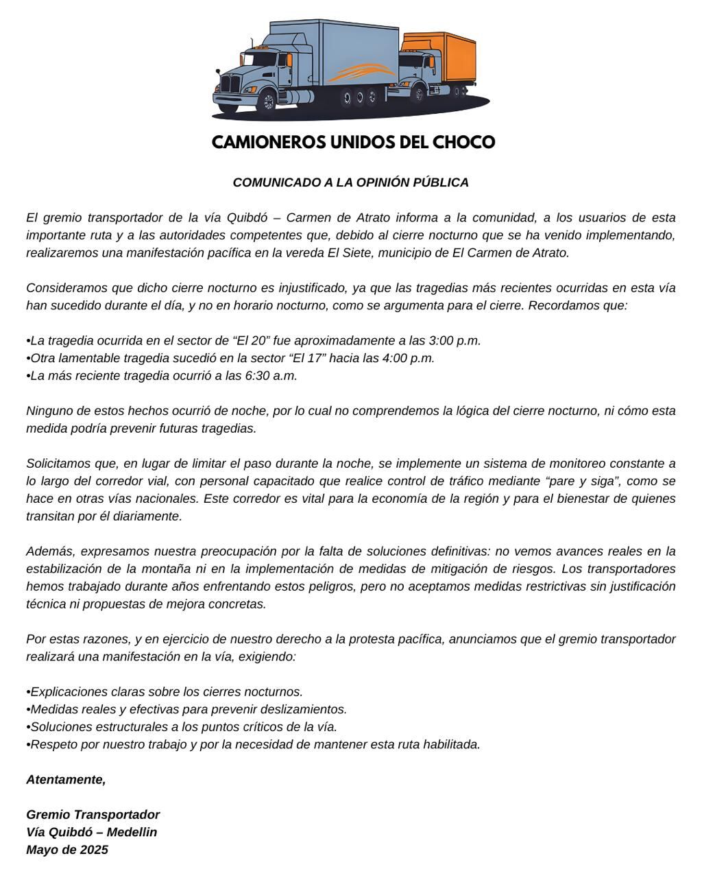 Los conductores unidos de Chocó, mediante un comunicado, explicaron las razones de la protesta: es por el cierre nocturno de la vía hacia Quibdó que realizan las autoridades de Chocó por el riesgo que existe debido a las lluvias y para evitar tragedias como las ocurridas en el sector el 20 y el 17. Todas ocurridas en el día y no en la noche, agregan.