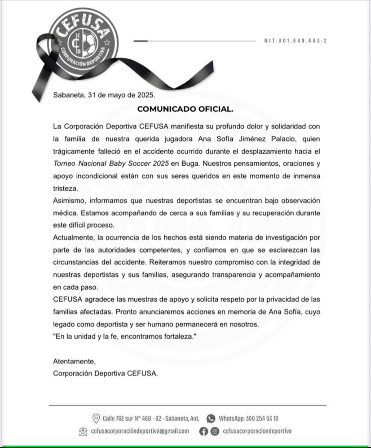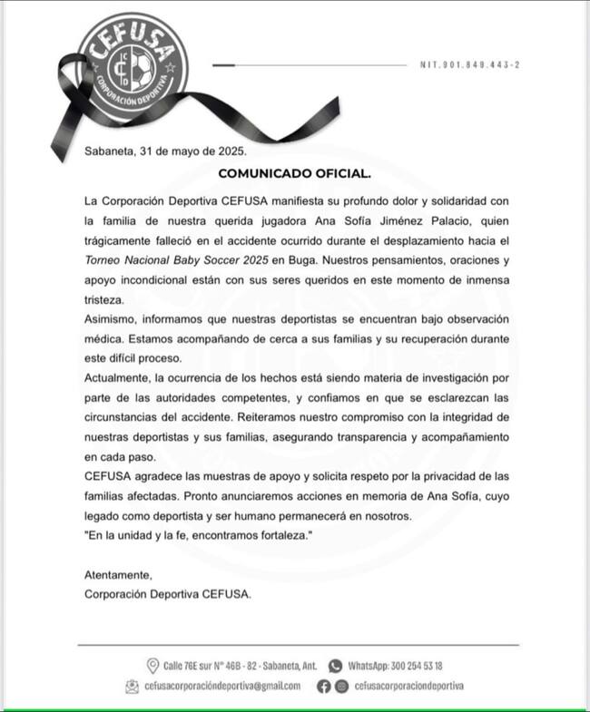 Mediante un comunicado La Corporación Deportiva CEFUSA, manifestó su profundo dolor y respaldo a la familia de la menor de 16 años fallecida en el siniestro cuando se desplazaban a Buga para participar en el Torneo Nacional Baby Soccer 2025.