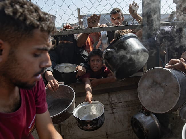 GAZA (-), 30/05/2025.- Internally displaced Palestinians gather outside a charity kitchen to receive limited rations amid a shortage of food, in Khan Younis, southern Gaza Strip, 30 May 2025. The United Nations has warned that "the entire population of Gaza is facing the risk of famine" since Israel closed border crossings on 02 March 2025, preventing the entry of essential supplies. The Gaza Government Media Office reported on 24 May that at least 58 people died due to malnutrition, and nearly 250 others due to a lack of food and medicine. EFE/EPA/HAITHAM IMAD / HAITHAM IMAD (EFE)