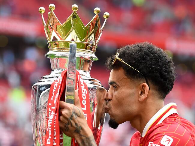 Liverpool (United Kingdom), 26/05/2025.- Liverpool player Luis Diaz celebrates with the Premier League trophy after the English Premier League match between Liverpool and Crystal Palace in Liverpool, Britain, 25 May 2025. (Reino Unido) EFE/EPA/PETER POWELL EDITORIAL USE ONLY. No use with unauthorized audio, video, data, fixture lists, club/league logos, 'live' services or NFTs. Online in-match use limited to 120 images, no video emulation. No use in betting, games or single club/league/player publications. / PETER POWELL (EFE)