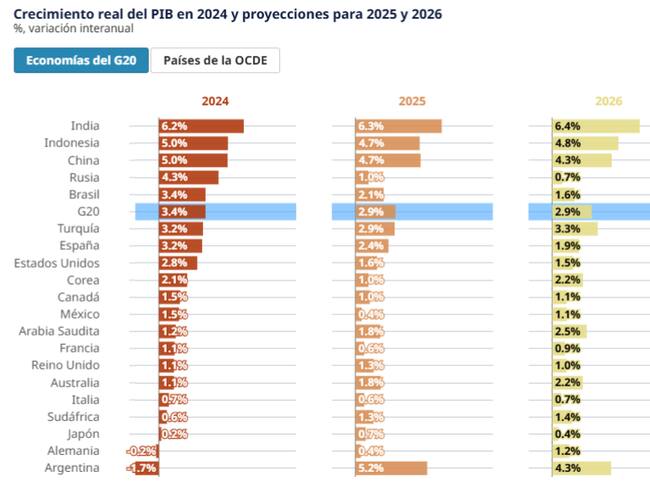 Crecimiento real del PIB en 2024 y proyecciones para 2025 y 2026 %, variación interanual / Tomado de la página oficial de OECD