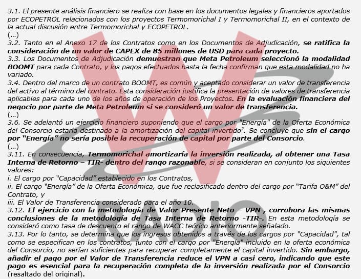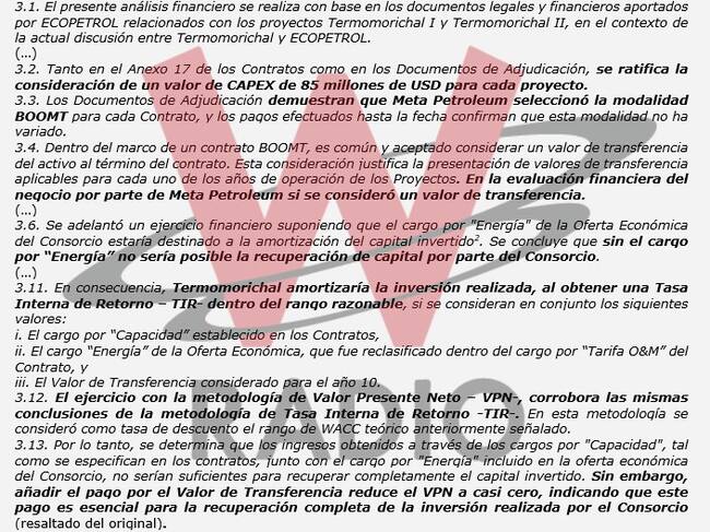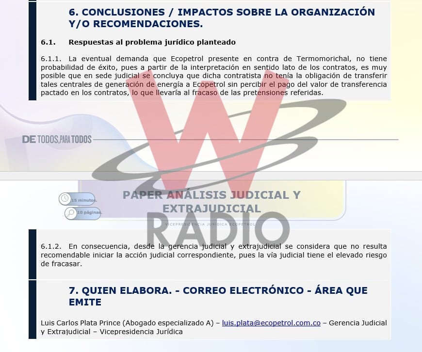 Sin embargo, La W conoció documentos internos de Ecopetrol en los que desde el año 2016, cuando Pacific Rubiales cedió a Ecopetrol su participación en Campo Rubiales, se señalaba que, según el análisis del contrato existente entre la filial de Pacific y el grupo de William Vélez, estaba claro que al final de la operación del contrato de entrega de energía, Ecopetrol podría hacerse a las plantas a costo cero.