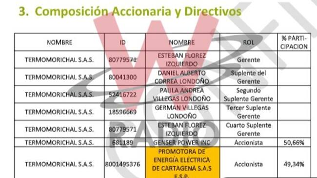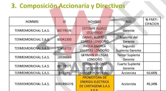 En el mencionado documento se establece la configuración accionaria de Termomorichal y allí se ve que el 49% de las acciones está en manos de Promotora de Energía Eléctrica de Cartagena SAS. Más adelante en el mismo análisis se ve que los beneficiarios o controlantes de dicha empresa son William Vélez y Serafino Iácono. Dos grandes ganadores del negocio que para la antigua administración de Ecopetrol nunca debió ser, pues no se debían pagar los 42 millones de dólares que Roa finalmente pagó.
