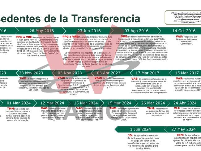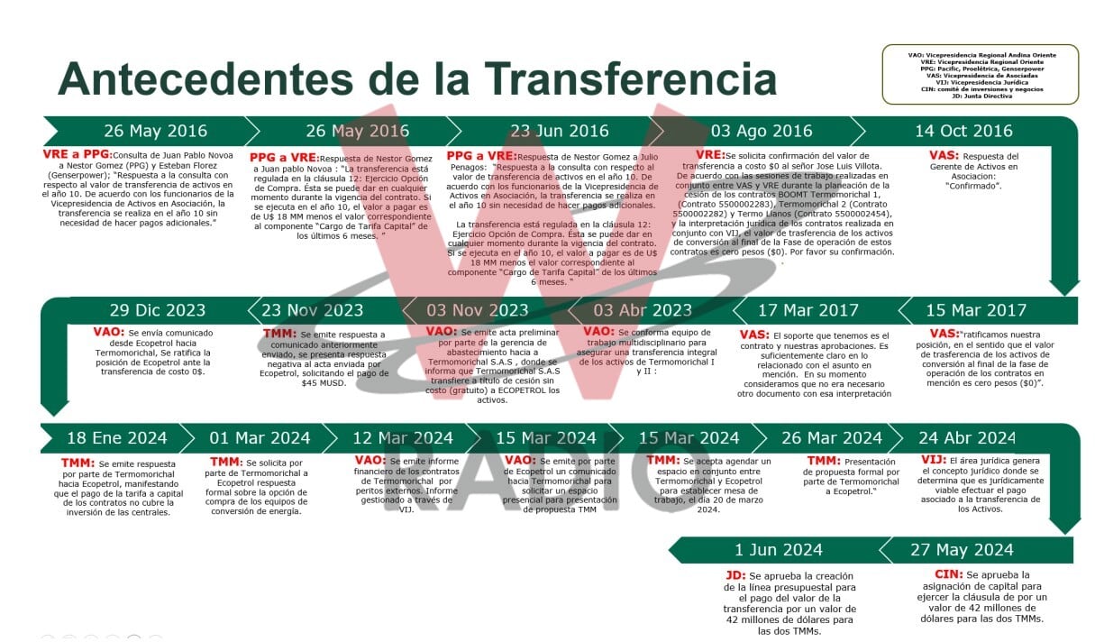 Sin embargo, algo pasó en 2023, poco tiempo después de que Ricardo Roa llegara a la presidencia de Ecopetrol. La línea de tiempo establecida por la misma compañía lo demuestra: en abril de 2023, apenas se posesionó Roa, se estableció un grupo de trabajo para avanzar en el negocio de Termomorichal. Y aunque en noviembre le dicen a Termomorichal que será una transacción gratuita, Termomorichal responde que le han de pagar 45 millones de dólares. La solución desde Ecopetrol fue hacer un nuevo análisis a los contratos con la empresa de Vélez. Es así como la Vicepresidencia Jurídica pide consejo a un perito externo y este define que lo mejor es pagarle a Termomorichal lo que pide.