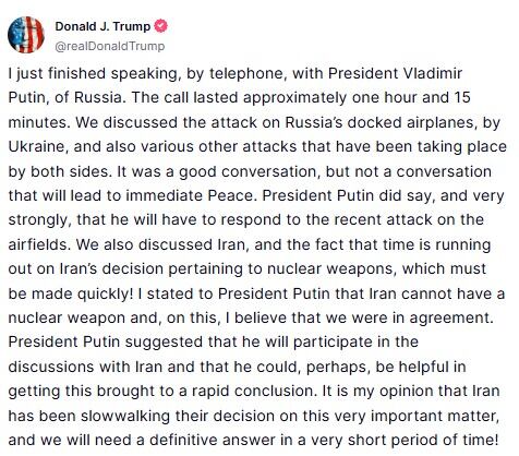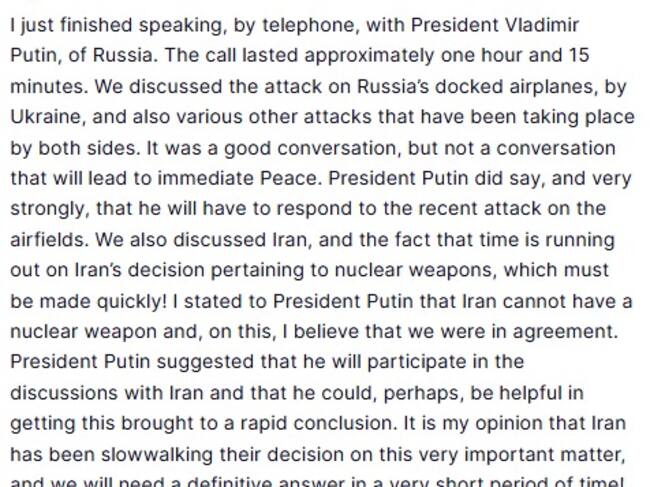 “Fue una buena conversación, pero no una que conduzca a una paz inmediata. El presidente Putin afirmó, con mucha firmeza, que tendrá que responder al reciente ataque a los aeródromos”, fueron las palabras del jefe de estado.