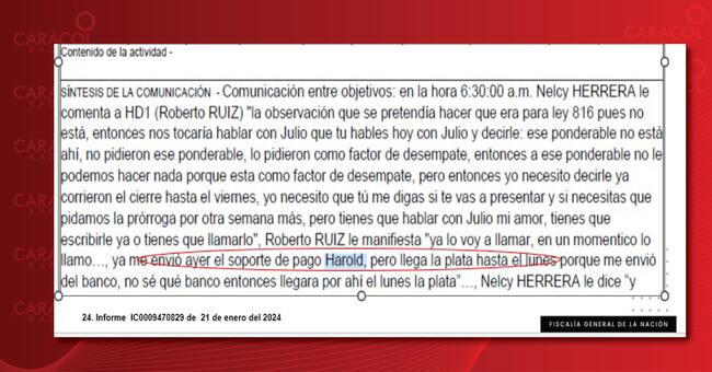 La Fiscalía documentó un encuentro entre la exasesora Nelcy Herrera y un señor identificado como Harold Castillo Marín, un posible delegado de esa empresa. También hay una interceptación en la que se habla de un comprobante de pago de la supuesta coima. (Ver foto)