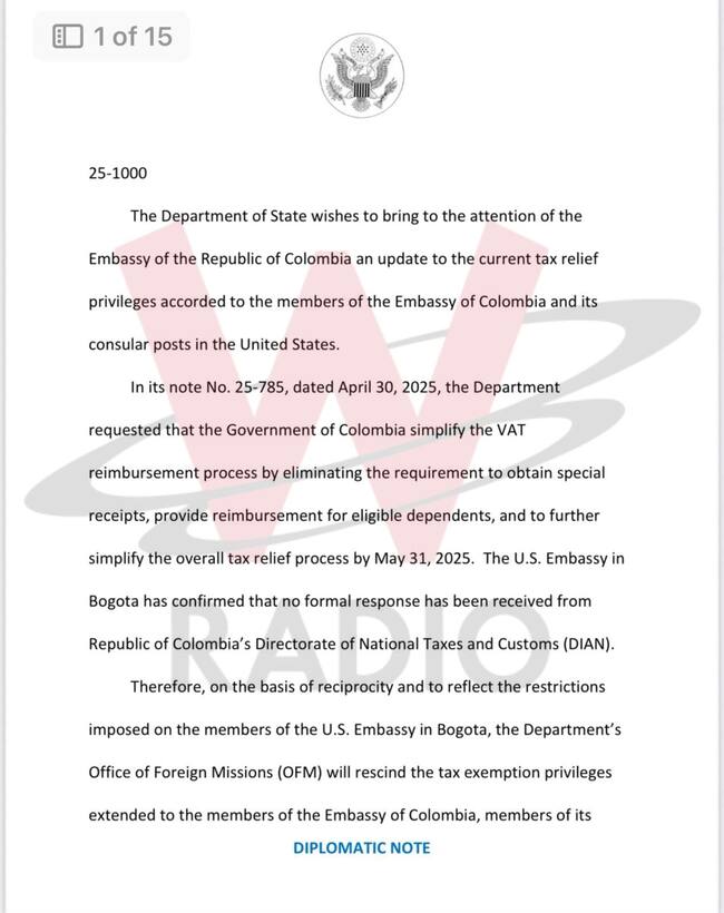 La nota diplomática anuncia que, a partir del 16 de junio, es decir de la segunda quincena de este mes, “se acabó lo que se daba” y los funcionarios colombianos tendrán que pagar los impuestos completos en Estados Unidos, como cualquier otro mortal.