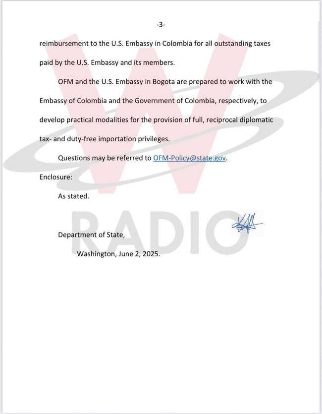 El último párrafo abre una esperanza para los diplomáticos colombianos. Dice la comunicación del Departamento de Estado que, si el Gobierno de Colombia cumple en la práctica con el principio de reciprocidad, los privilegios de exención de impuestos serán restaurados.