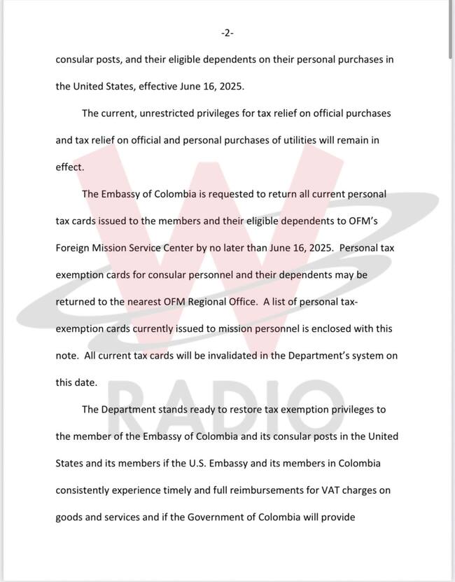 El Departamento de Estado también solicita en la nota que todos los diplomáticos colombianos, del embajador Daniel García Peña para abajo, devuelvan antes de esa fecha, 16 de junio, sus tarjetas de exención de impuestos que serán desactivadas.