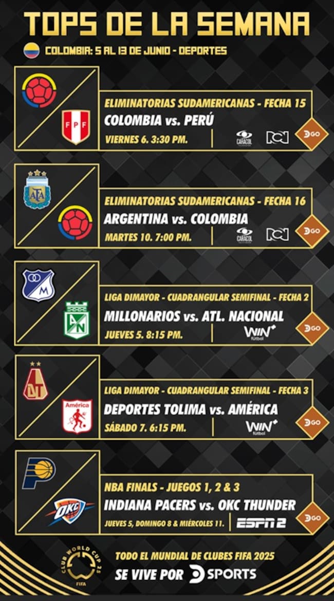 En el marco de la previa del partido de la Selección Colombia ante Perú por Eliminatorias Sudamericanas rumbo al Mundial 2026, también se definen torneos importantes desde distintas disciplinas deportivas. Los cuadrangulares finales de la Liga, las finales de la NBA, la fase final de Roland Garros, Final de Nations League y Gran Premio de Aragón, son algunas de las competencias que se podrán disfrutar a través de Directv.