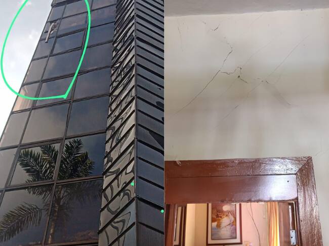 Uno de los ventanales dañados en el Concejo de Manizales (foto izquierda) y el agrietamiento de una casa en Pácora (foto derecha). Fotos: Unidad de Gestión del Riesgo de Manizales y la Jefatura de Gestión del Riesgo de Caldas.