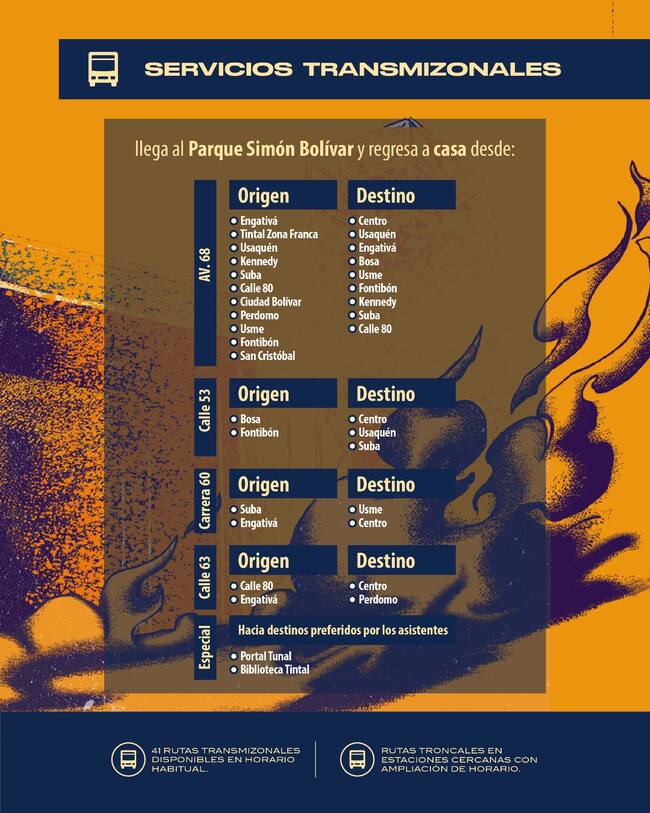 “Estas rutas especiales, dirigidas para la salida del evento, tienen como destino principal la Biblioteca El Tintal y el Portal Tunal”, afirmó María Fernanda Ortiz, gerente de TransMilenio.