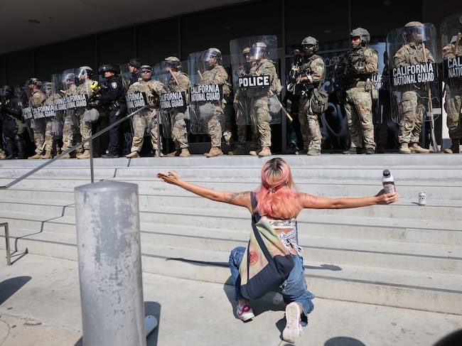 FOTODELDÍA CJX27. LOS ANGELES (ESTADOS UNIDOS), 09/06/2025.- Una manifestante se arrodilla frente a miembros de la Guardia Nacional de California este lunes, frente al edificio federal Edward R. Roybal en Los Ángeles, California (Estados Unidos). Aproximadamente 2.000 efectivos de la Guardia Nacional fueron desplegados el 08 de junio en Los Ángeles por el presidente estadounidense Donald Trump, aunque el estado de California no había solicitado ninguna ayuda adicional, y las protestas han continuado contra las redadas de aplicación de la ley de inmigración de la administración Trump en los últimos dos días. EFE/EPA/Allison Dinner / ALLISON DINNER (EFE)