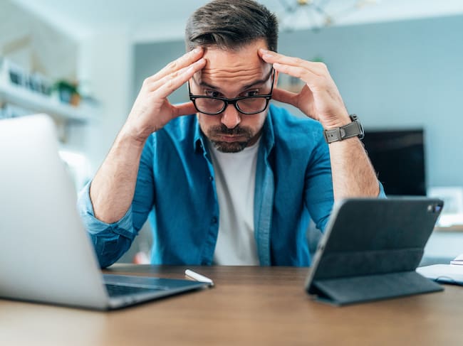 Tired Businessman working at home using laptop and digital tablet. Overworked young man with eyeglasses looking at laptop bored and anxious. Man with headache holding head in hands in front of digital devices. / filadendron