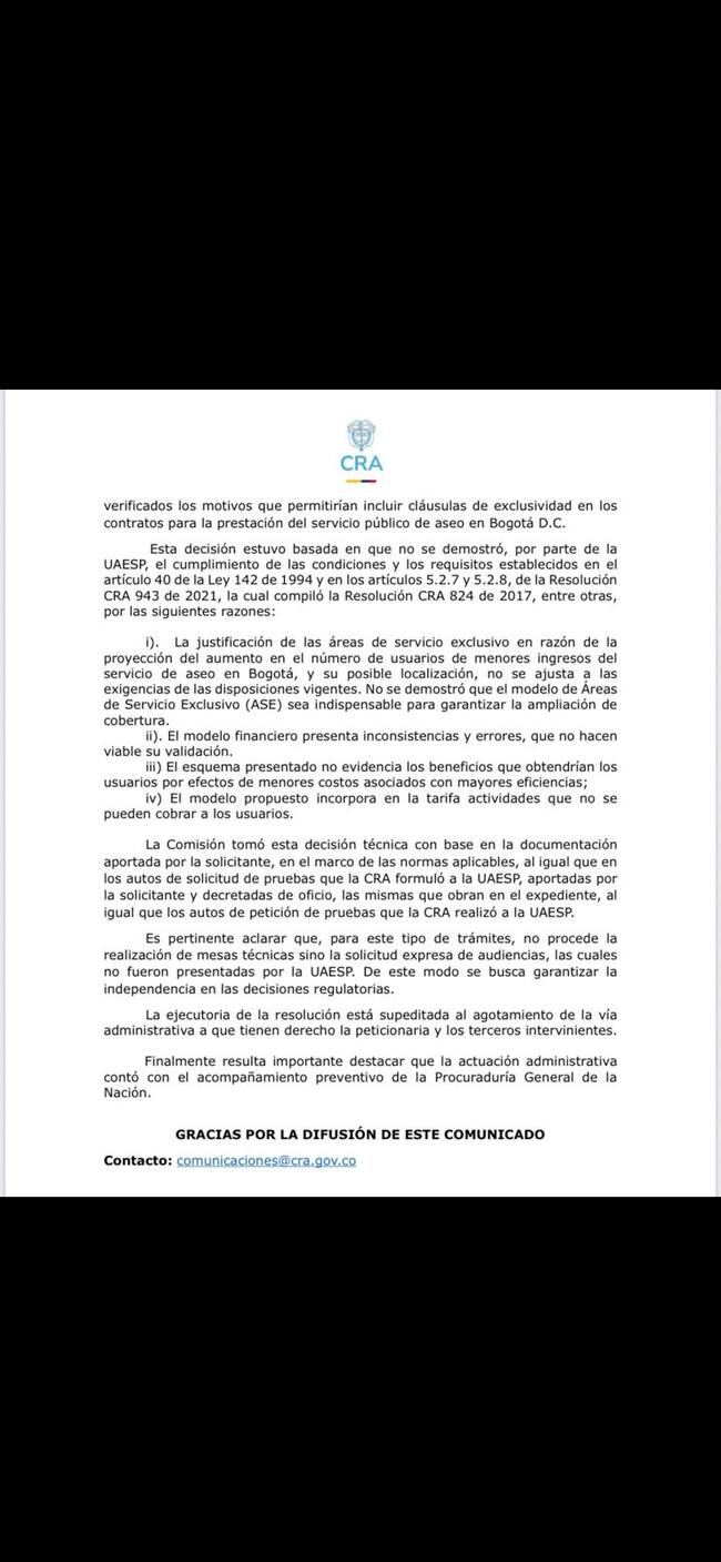 ¿Por qué la CRA negó la solicitud del nuevo modelo de aseo?