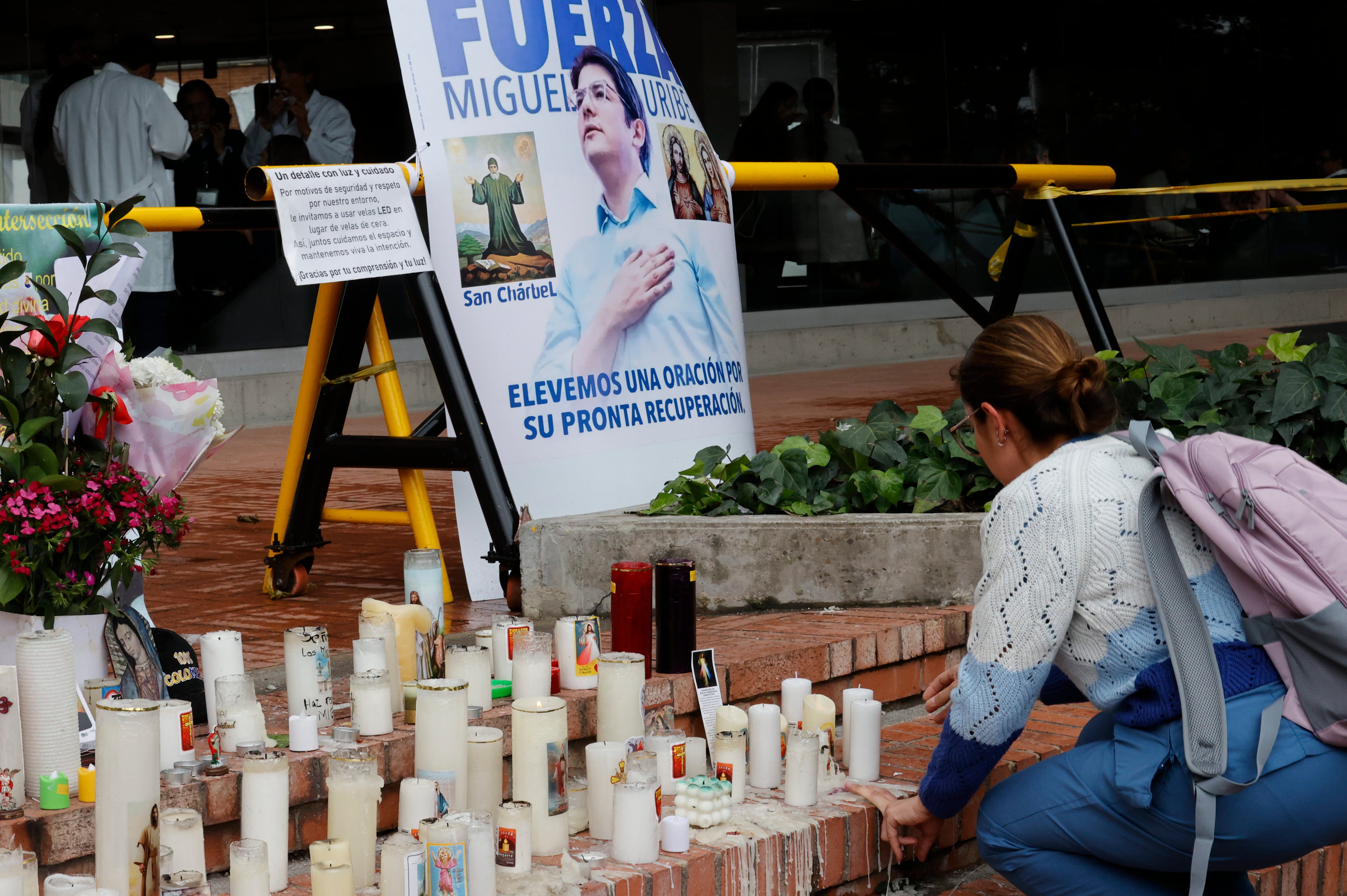 AME5865. BOGOTÁ (COLOMBIA), 13/06/2025.- Una mujer pone velas en un altar para pedir por la recuperación del senador y precandidato presidencial colombiano Miguel Uribe Turbay. / Mauricio Dueñas Castañeda