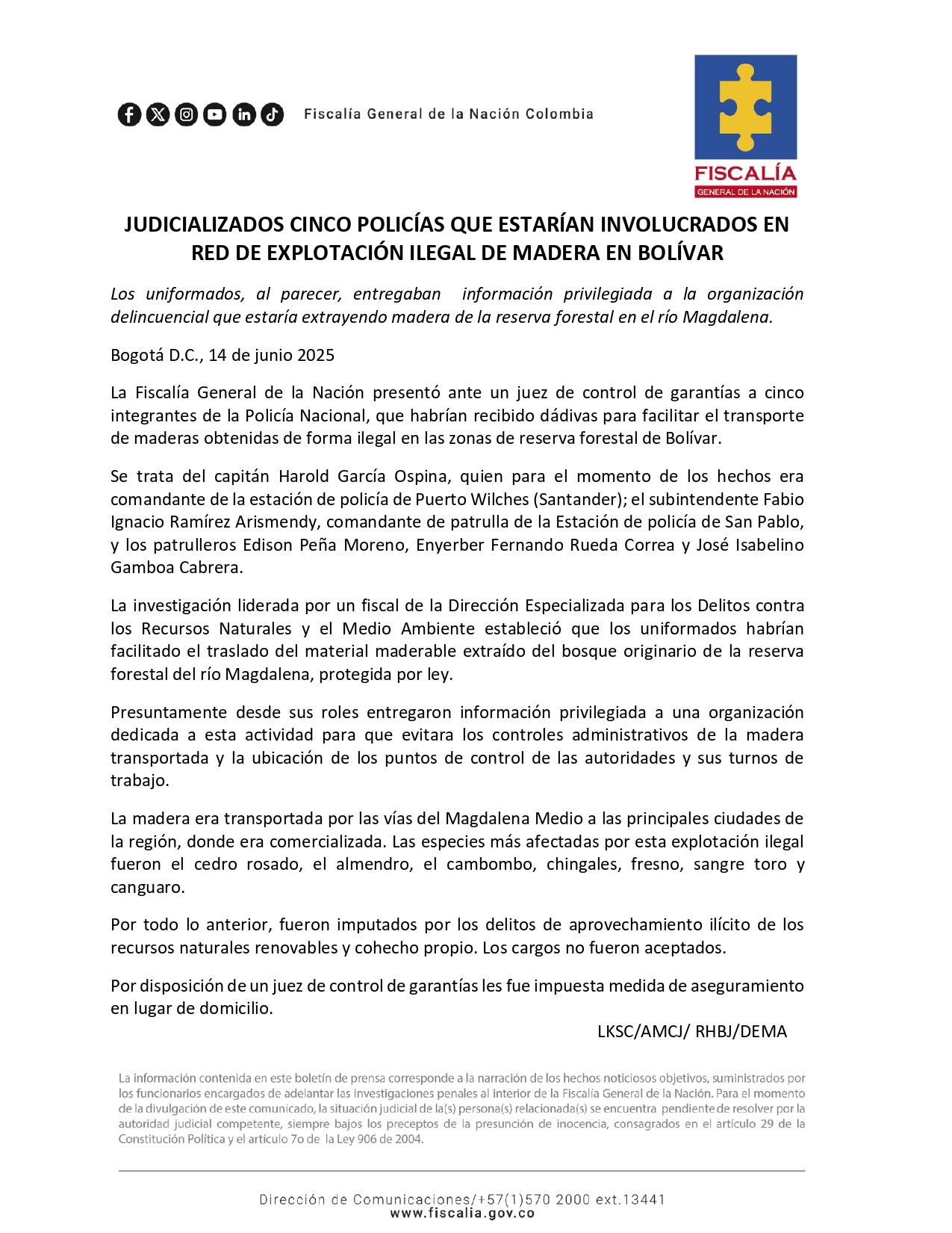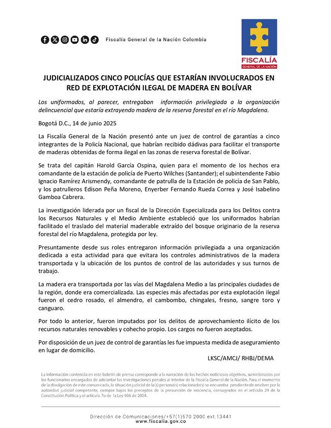“Permitía el transporte del recurso forestal maderal, recibiendo en su cuenta una asignación por un valor de $3 millones para la fecha del 31 de marzo del 2023, 2 consignaciones por el valor de $800.000 en las fechas del 24 de mayo de 2023 y 25 de junio de 2023, quien valiéndose de su calidad de servidor público y a su cargo como comandante de Estación de Policía del municipio de Puerto Wilches Santander, omitía un acto propio de su cargo, observándose como ficha clave para que el líder del grupo delincuencial alias el Primo y sus demás integrantes lograra su objetivo, aprovechar, mantener, transformar, transportar y comercializar el recurso forestal maderables”, se escucha desde la entidad judicial.