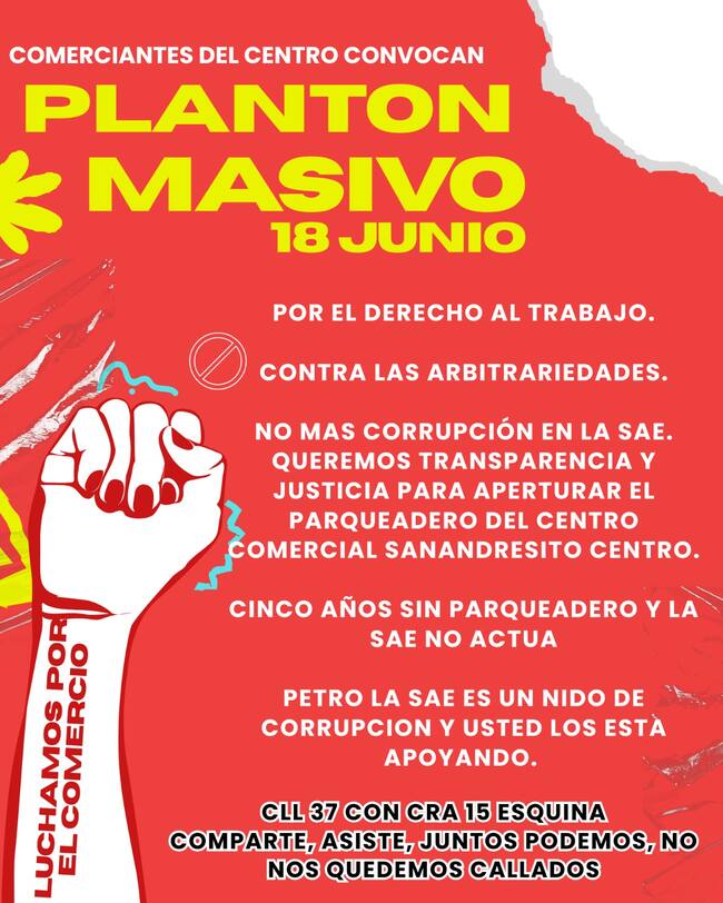 Los comerciantes de Sanandresito Centro convocaron a un plantón masivo a las afueras del establecimiento, para pedir por la apertura del parqueadero del centro comercial, dicen que protestarán pidiendo transparencia y justicia a la Sociedad de Activos Especiales - SAE, quienes, según los comerciantes, desde hace cinco años tomaron este bien, pero el mismo desde esa fecha no ha vuelto funcionar.