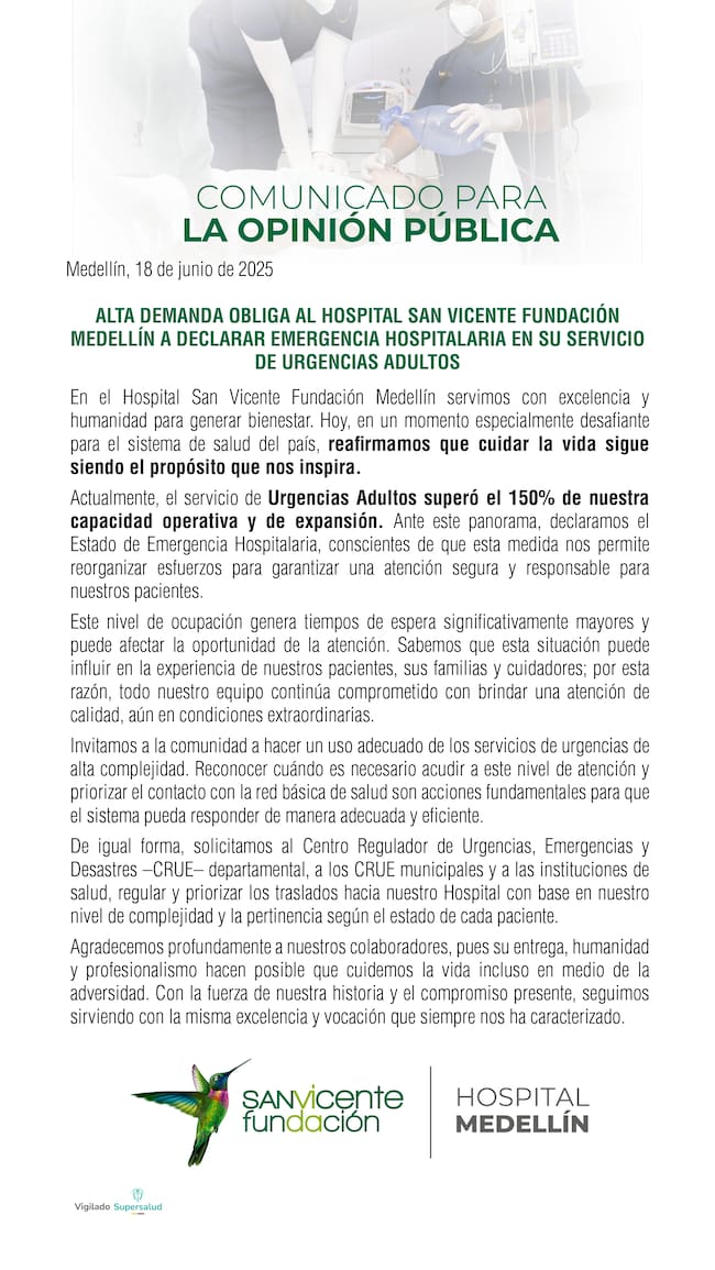 El Hospital San Vicente Fundación de Medellín informó que su capacidad en el área de urgencias superó el 150% de ocupación, lo que afecta el servicio a los pacientes.