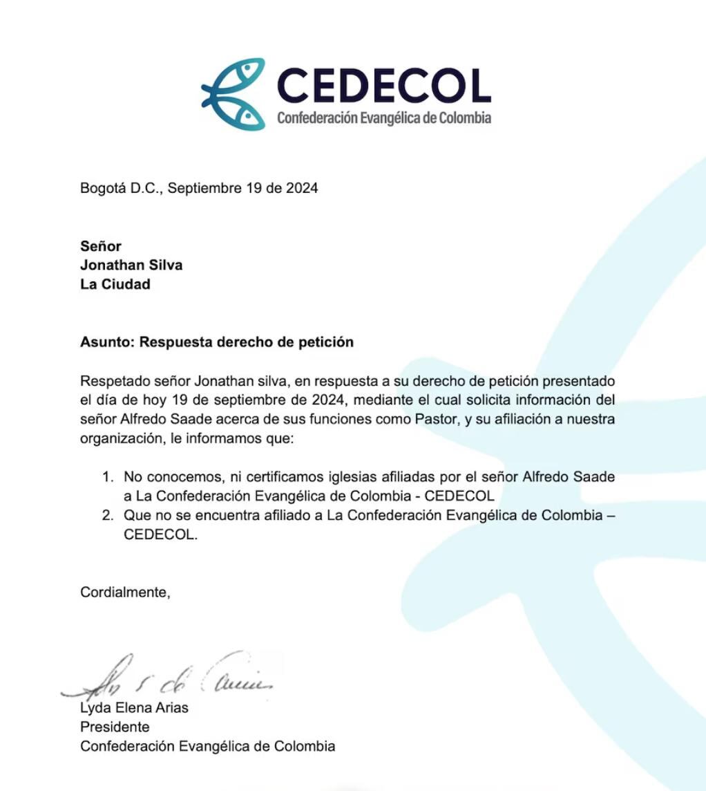 Caracol Radio se comunicó con la Conferencia Evangélica de Colombia, quienes confirmaron que Saade no hace parte de la comunidad de pastores ni tampoco tiene vinculación o credenciales que lo avalen como tal. Esto fue dado a saber en un comunicado en 2024, pero le revelaron hoy mismo a este medio de comunicación que el estatus de Saade sigue siendo el mismo.