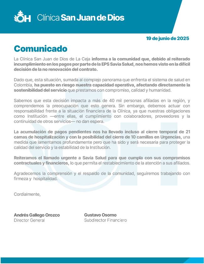 La Clínica San Juan de Dios de La Ceja informó que no renovará su contrato con la EPS Savia Salud, debido al reiterado incumplimiento en los pagos por parte de esta entidad, una situación que pone en riesgo la continuidad del servicio y afecta a más de 40 mil personas en la región.