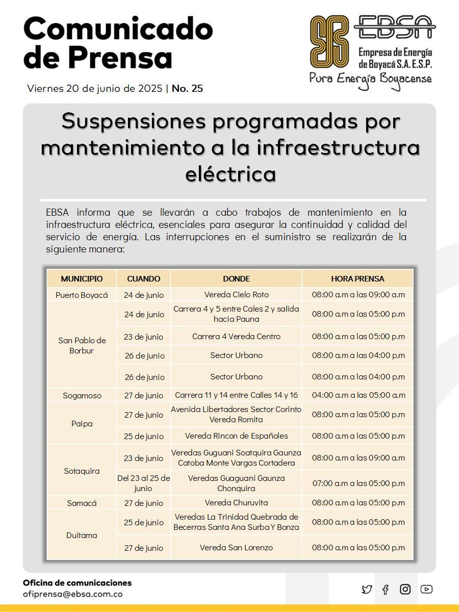 La Empresa de Energía de Boyacá S.A. E.S.P. informó que entre el 23 y el 27 de junio se realizarán trabajos de mantenimiento en diferentes zonas del departamento, lo que implicará la suspensión temporal del servicio de energía en varios sectores rurales y urbanos. Las labores están dirigidas a optimizar el funcionamiento de la infraestructura eléctrica y prevenir fallas futuras en el sistema.