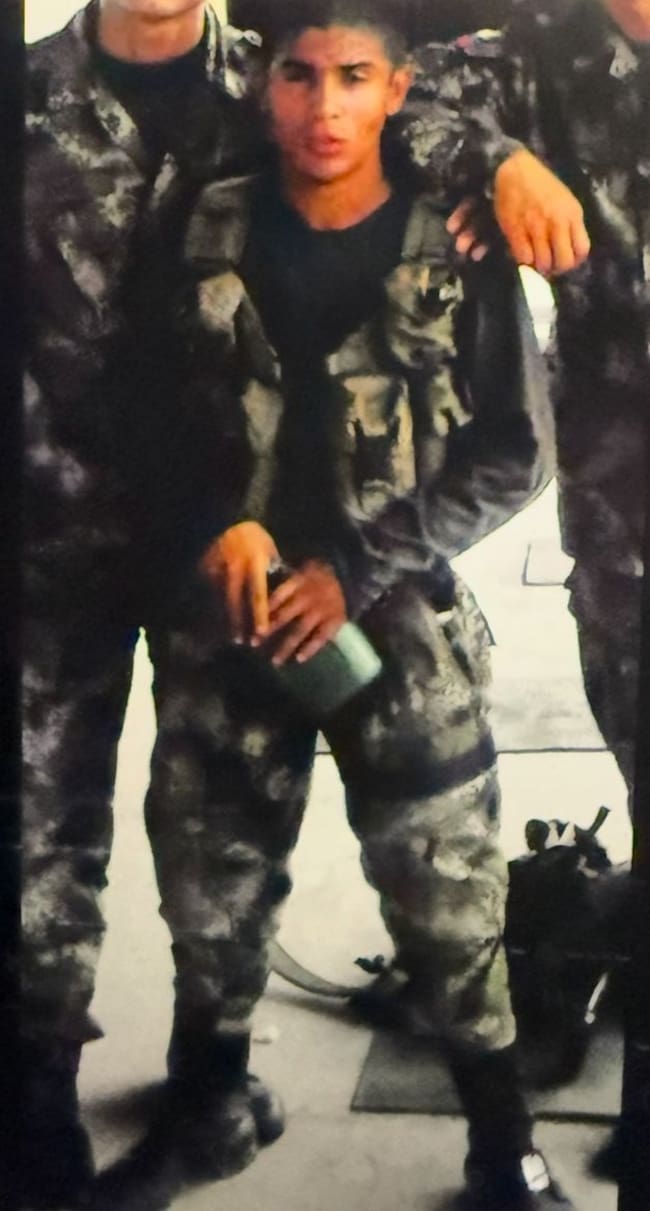 En otra, vistiendo uniforme camuflado, entre dos conscriptos más altos que él.