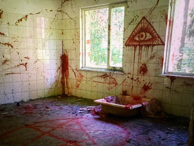 El hombre que agarró a patadas y también golpeó con un objeto al pistolero capturado, publicó en sus redes sociales la imagen de un lugar con baldosas blancas teñidas con tinta roja como si fuera sangre, con la imagen del “Ojo que lo ve todo” sobre una pared, y el pentagramatón, un símbolo esotérico, pintado en el piso.