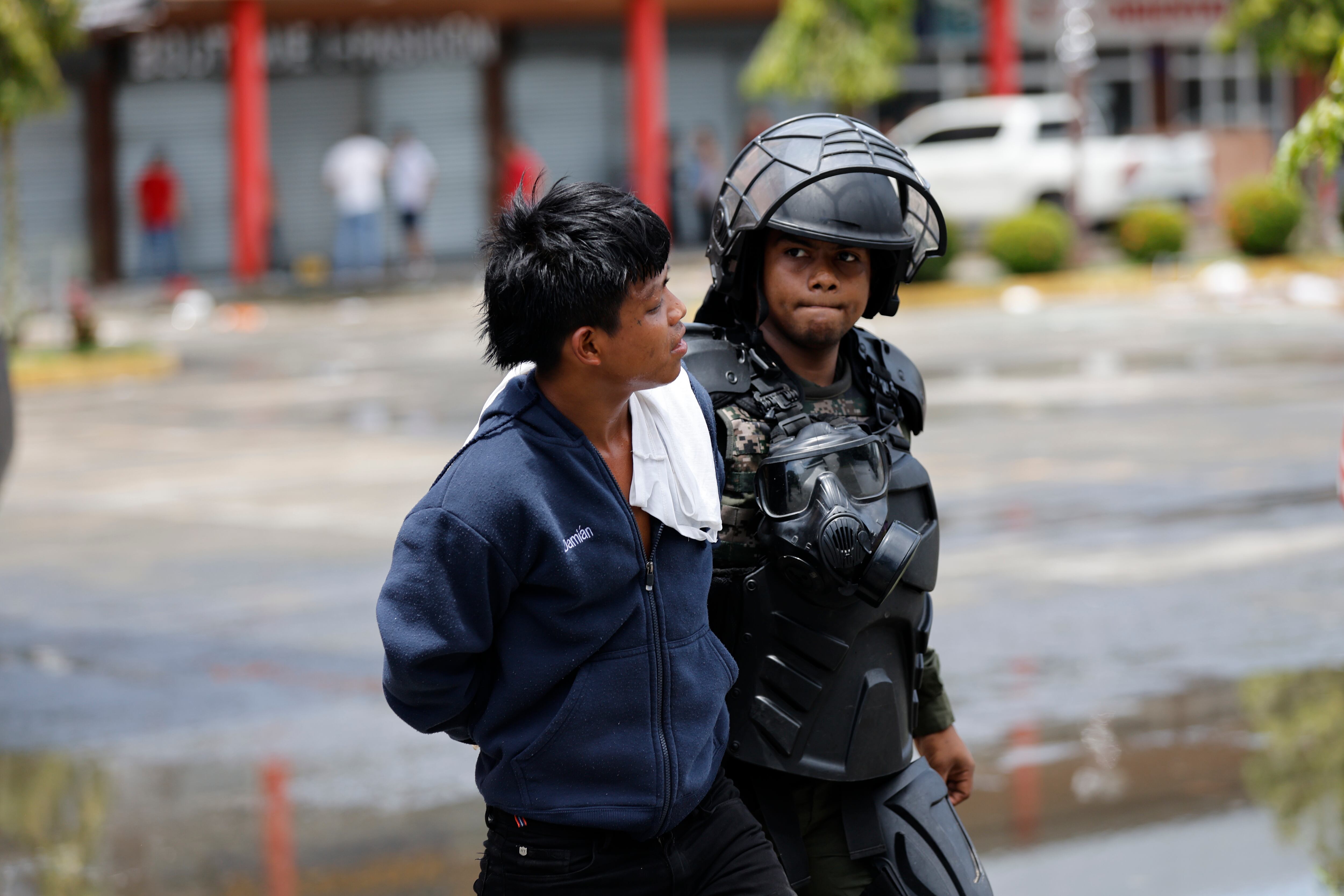 AME7401. CHANGUINOLA (PANAMÁ), 20/06/2025.- Un integrante de las Fuerzas Armadas custodia a un manifestante durante una protesta este viernes en la ciudad de Changuinola una de las principales de la provincia de Bocas del Toro (Panamá). Las protestas en la provincia de Bocas del Toro (Caribe) en Panamá "escalaron peligrosamente" con saqueos a las instalaciones de la bananera Chiquita y vandalismo a algunas instalaciones públicas, alertó el Gobierno panameño que señala como responsables a los "grupos radicalizados". EFE/ Bienvenido Velasco / Bienvenido Velasco